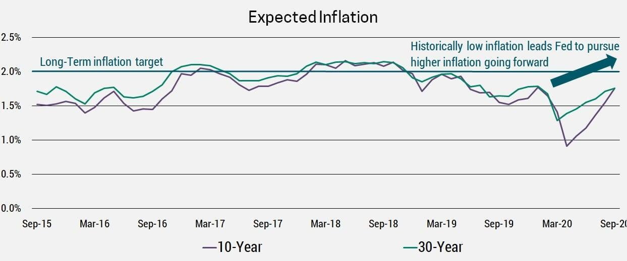 - Inflation Hedge: As Inflation inches higher there will be political pressure on central banks not to raise interest rates due to high public sector debt. This means Inflation will likely be allowed to move above target. As such, investors should own hard assets, gold, value stocks and short-term debt, all if which perform relatively better during periods of higher inflation.